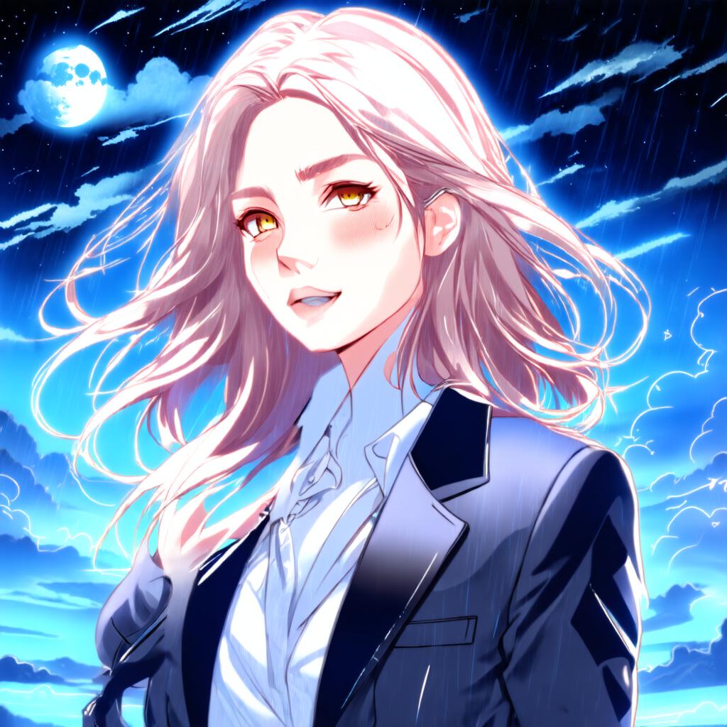 prompt = 'Anime style illustration of a girl wearing a suit. A moon in sky. In the background we see a big rain approaching. text "InstantX" on image'
